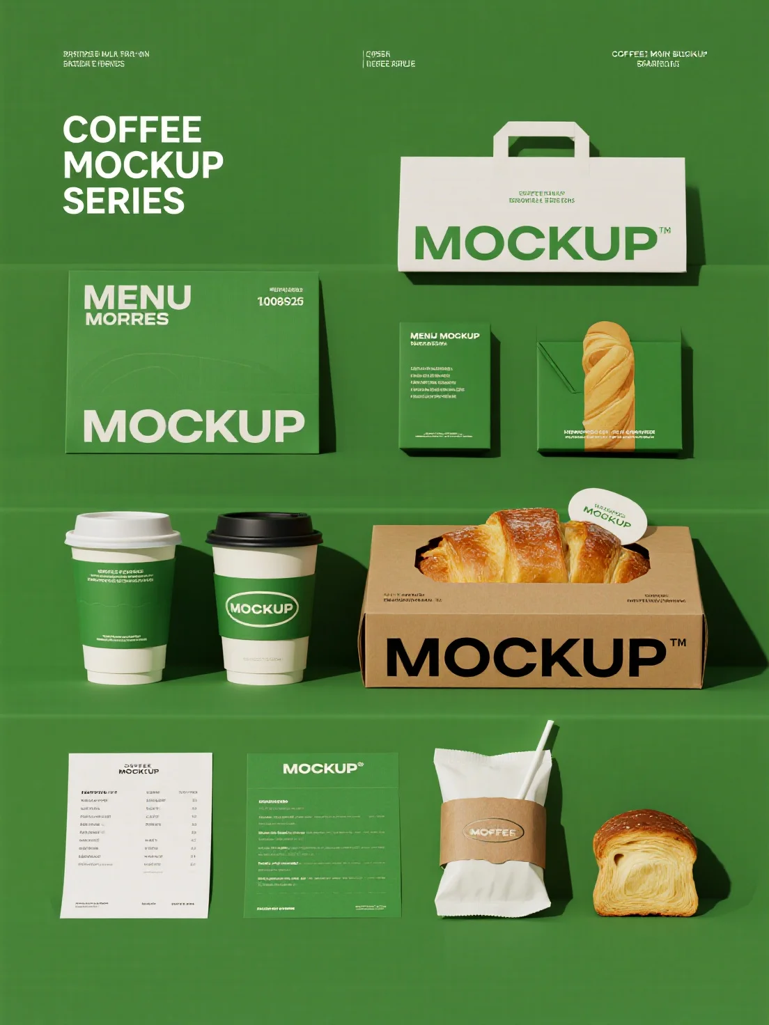 面包烘焙品牌简约包装设计,极简烘培包装风格。以鲜明绿#008000 为主色调,搭配简洁白色字体。涵盖咖啡盒、手提袋、纸杯、菜单、卡片、包装袋、吸管杯等多样物品,突出‘MOCKUP’‘COFFEE MOCKUP SERIES’‘MENU MOCKUP’ 等简洁醒目文字。营造干练时尚、充满品质感的氛围,契合烘焙品牌简约包装定位