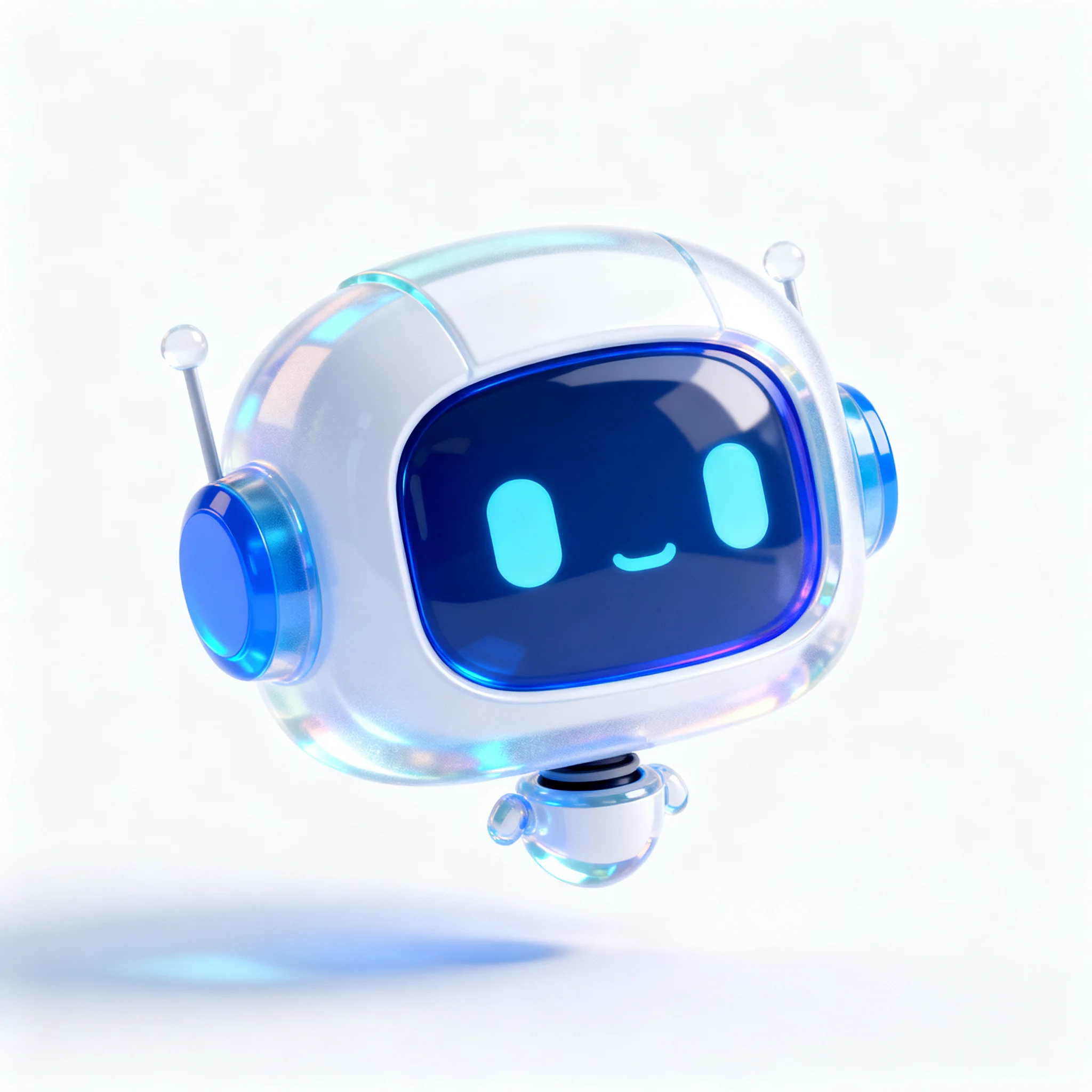 一个小机器人头像图标,仰视图,材质透明,蓝白配色,磨砂玻璃质感,透明感,UI/UX设计风格,梦幻风格,白色背景,影棚灯光,色彩明亮,3D 艺术,使用 C4D 软件制作,配合oc渲染器,Pinterest、Dribbble、behance,细节,高清,纯白色背景
