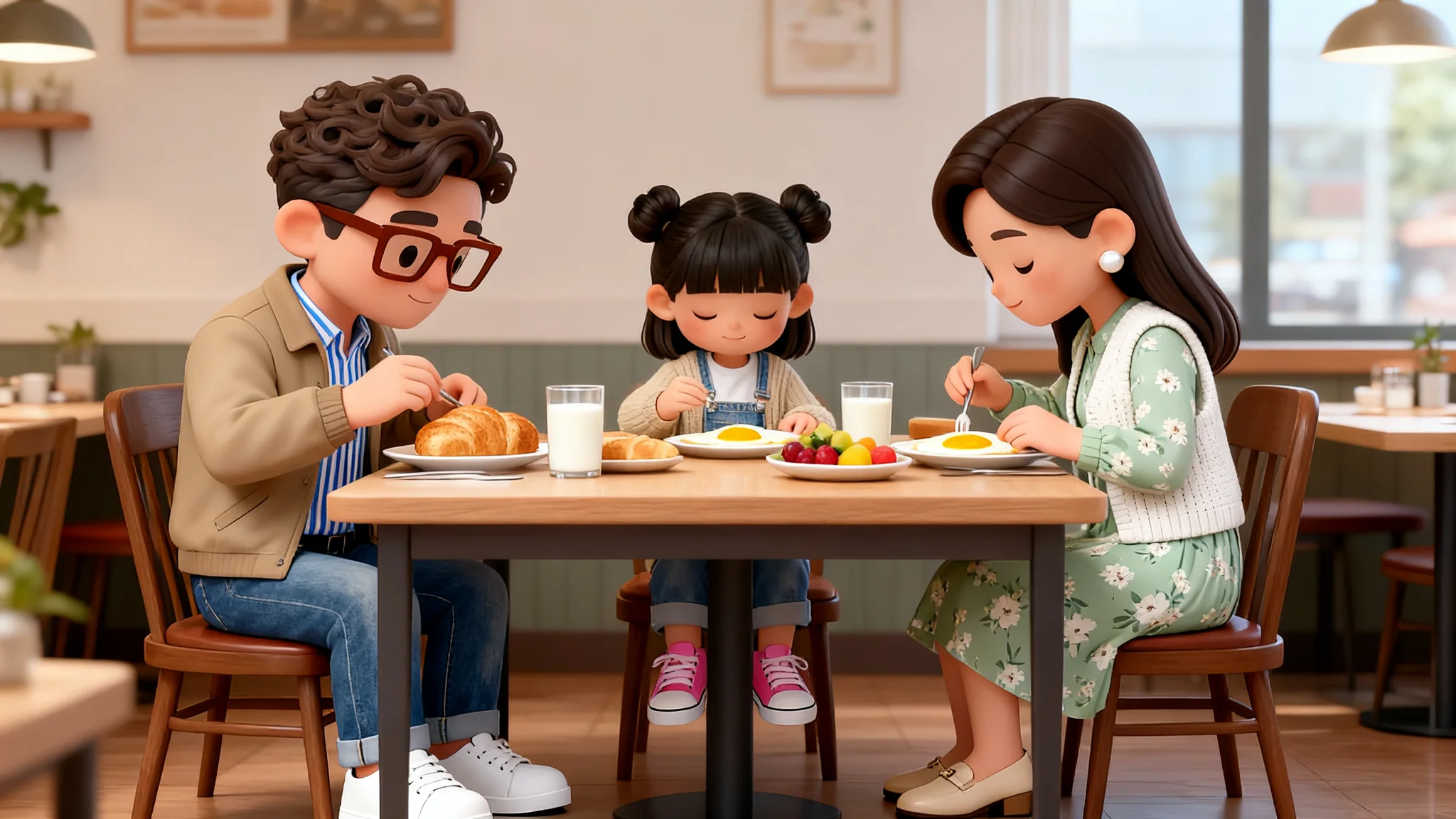 这是一家三口,图一是爸爸,图二是女儿,图三是妈妈,请根据以下需求生成对应分镜画面,注意保持人物特征,妆容,服饰等的一致性。 1. 女儿刚起床,掀开被子准备下床 2. 一家三口在吃早餐 3. 爸爸妈妈送女儿到校车站坐车,校车上有标志”阳光幼儿园“ 4. 爸爸骑单车上班,妈妈挥手送别 5. 妈妈在家里织毛衣
