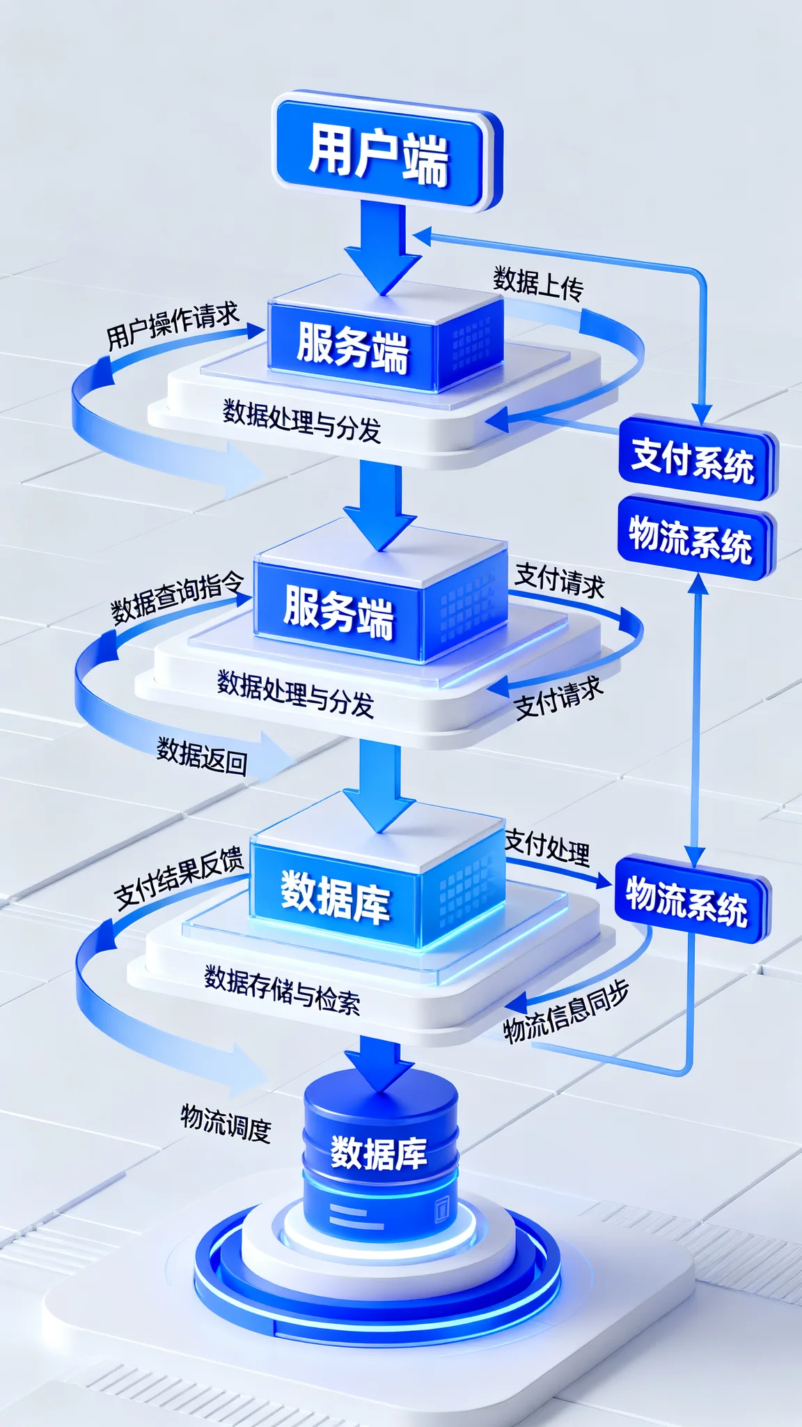 以极具立体感的视角,通过流程图精准呈现销售平台技术架构图。清晰展现各模块间层次分明的关系,动态且直观地展示数据在各模块间的流动方向,以及交互逻辑,全方位呈现电商平台技术架构的全貌