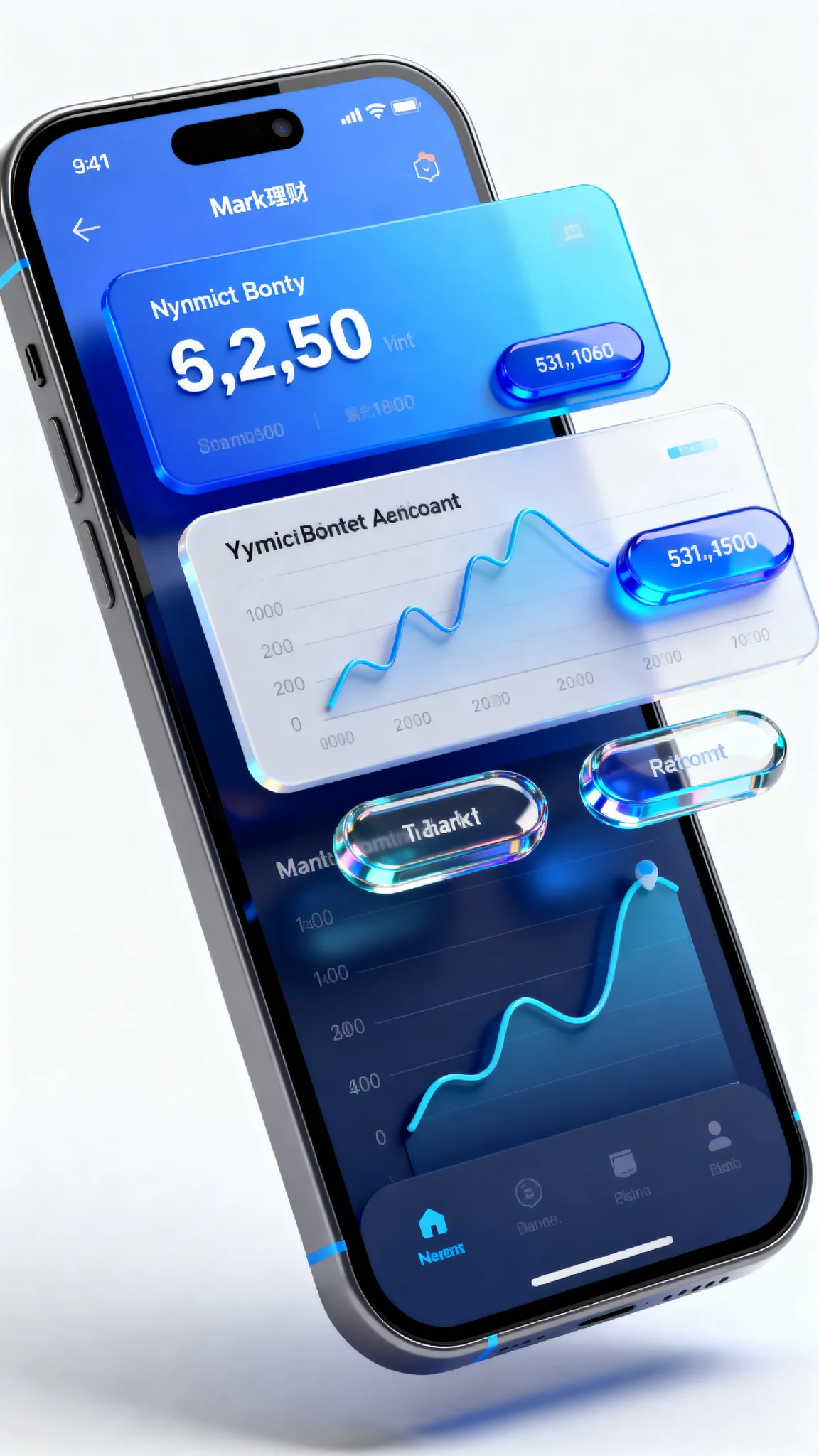 金融理财APP手机UI设计,C4D风格高级UI,3D立体数据图表,蓝色渐变界面,悬浮卡片设计,玻璃拟态按钮,动态余额数字显示,市场趋势曲线图,纯白色背景,杰作,高细节