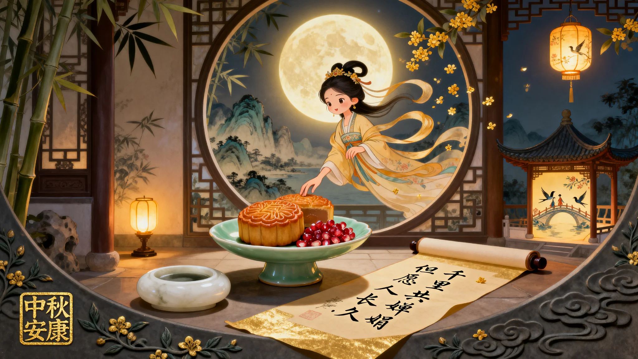 画面中央一轮皓月浮于工笔山水间,Q版嫦娥自月宫翩然而降,霓裳飘带卷起鎏金桂花雨,指尖轻触的青瓷盘盛着莲蓉月饼与石榴籽,白玉砚台旁「但愿人长久,千里共婵娟」的诗句以簪花小楷流淌于泥金笺。 背景层叠苏式园林的月洞窗与真实竹影,蟾宫灯盏在廊下投暖光晕,远处亭台飞檐悬着绛纱宫灯,灯面手绘鹊桥相会图。所有元素浸润在蜜合色月光中,画面左下角有烫金篆章「中秋安康」,边缘点缀缠枝莲纹与暗云纹浮雕质感。
