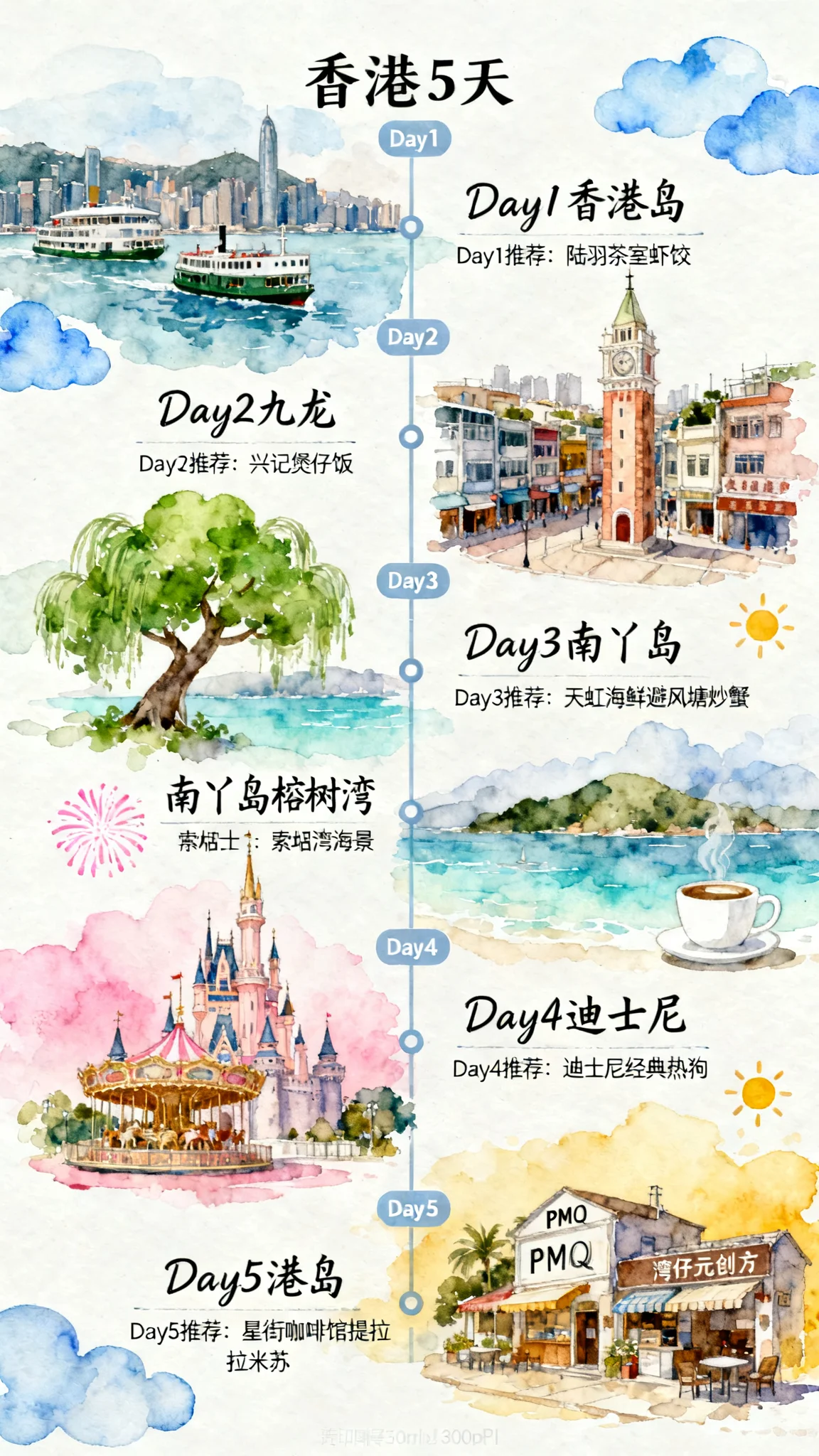 水彩风香港 5 天行程插画,以横向时间轴形式呈现每日核心景点:Day1 水彩绘太平山顶凌霄阁与维多利亚港渡轮,Day2 水彩绘油麻地庙街与尖沙咀钟楼,Day3 水彩绘南丫岛榕树湾与索罟湾海景,Day4 水彩绘香港迪士尼城堡与旋转木马,Day5 水彩绘 PMQ 元创方与湾仔星街咖啡馆;每个场景旁标注手写体日期(如 “Day1 香港岛”“Day3 南丫岛”),搭配 “Day1 推荐:陆羽茶室虾饺”“Day2 推荐:兴记煲仔饭”“Day3 推荐:天虹海鲜避风塘炒蟹” 等餐饮推荐小字;点缀淡蓝云朵、绿色榕树、粉色烟花、白色咖啡杯、小太阳等装饰元素;风格清新文艺,画面有通透水彩晕染效果(如维港海水的淡蓝渐变、迪士尼城堡的浅粉晕开、南丫岛渔村的暖黄过渡),高清晰度(300dpi),适合打印或手机屏保。