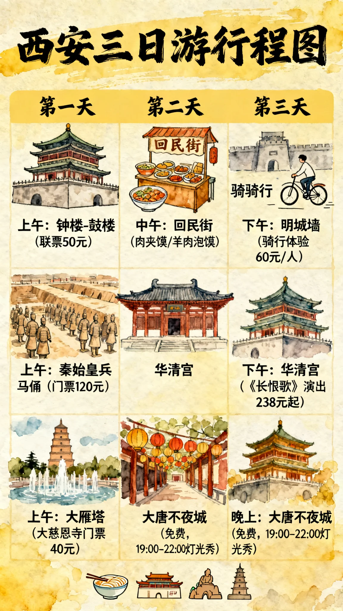 请帮我生成一张西安三日游的中文手绘行程图