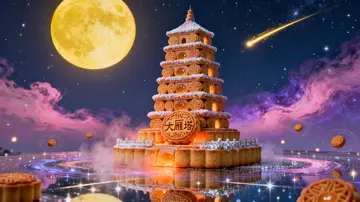 夜晚奇幻场景,墨蓝色夜空被渐变粉紫的星云晕染,悬浮着一轮暖黄巨大圆月,天际偶尔掠过拖着金色光尾的流星;大雁塔表面全由圆形月饼拼合而成 —— 基座用厚款月饼堆叠,缝隙间漫出暖橙光雾,某个月饼表面印着清晰的建筑物名字;主体部分严格贴合建筑自身轮廓,用大小渐变的印花月饼紧密排列,建筑表面的通透区域(如孔洞、镂空处)嵌着半透明流心月饼,透出琥珀色柔光,似建筑内部点亮的灯火;建筑边缘与细节处用裹着糖霜的月饼塑造,糖霜在月光下泛着细碎银光;下方是映着星云的镜面质感地面,倒影中建筑的光与天际星光交织,周围飘着会缓慢旋转的迷你月饼造型光点,整体背景充满星云流星的奇幻感,建筑的灯光与月饼质感相互呼应,仅通过月饼形态还原建筑本身特色,无多余非适配结构描述