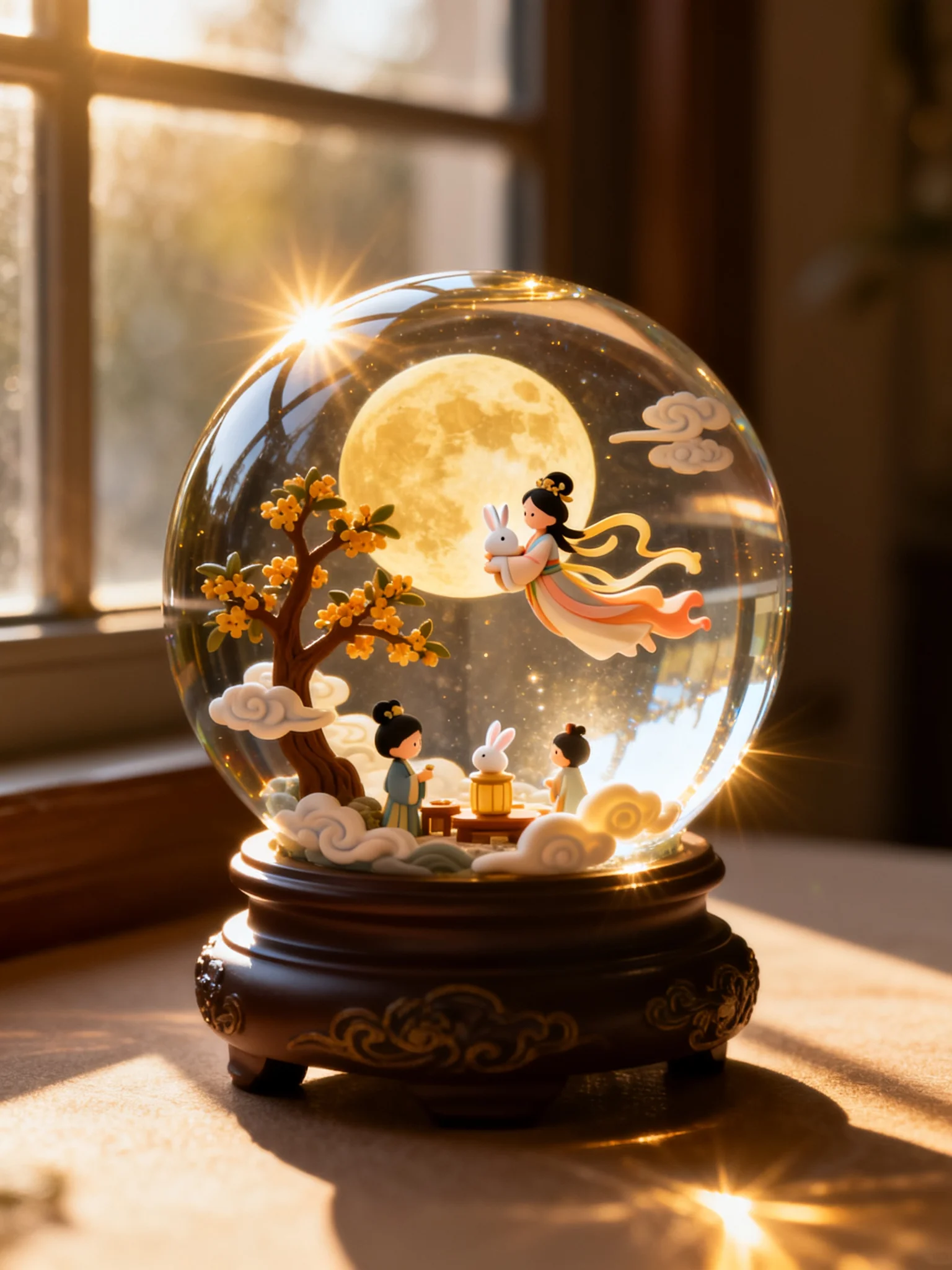 一枚精致的水晶球静静摆放在窗户旁温暖柔和的桌面上,背景虚化而朦胧,暖色调的阳光轻柔地穿透水晶球,折射出点点金光,温暖地照亮了四周的微暗空间。水晶球内部自然地呈现出一个以 {嫦娥奔月} 为主题的迷你立体世界,细腻精美而梦幻的3D景观,人物与物体皆是可爱的Q版造型,精致而美观,彼此之间充满灵动的情感互动。整体氛围充满了东亚奇幻色彩,细节极为丰富,呈现出魔幻现实主义般的奇妙质感。整个场景如诗如梦,华美而典雅,散发着温馨柔和的光芒,仿佛在温暖的光影中被赋予了生命。