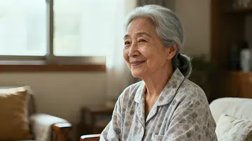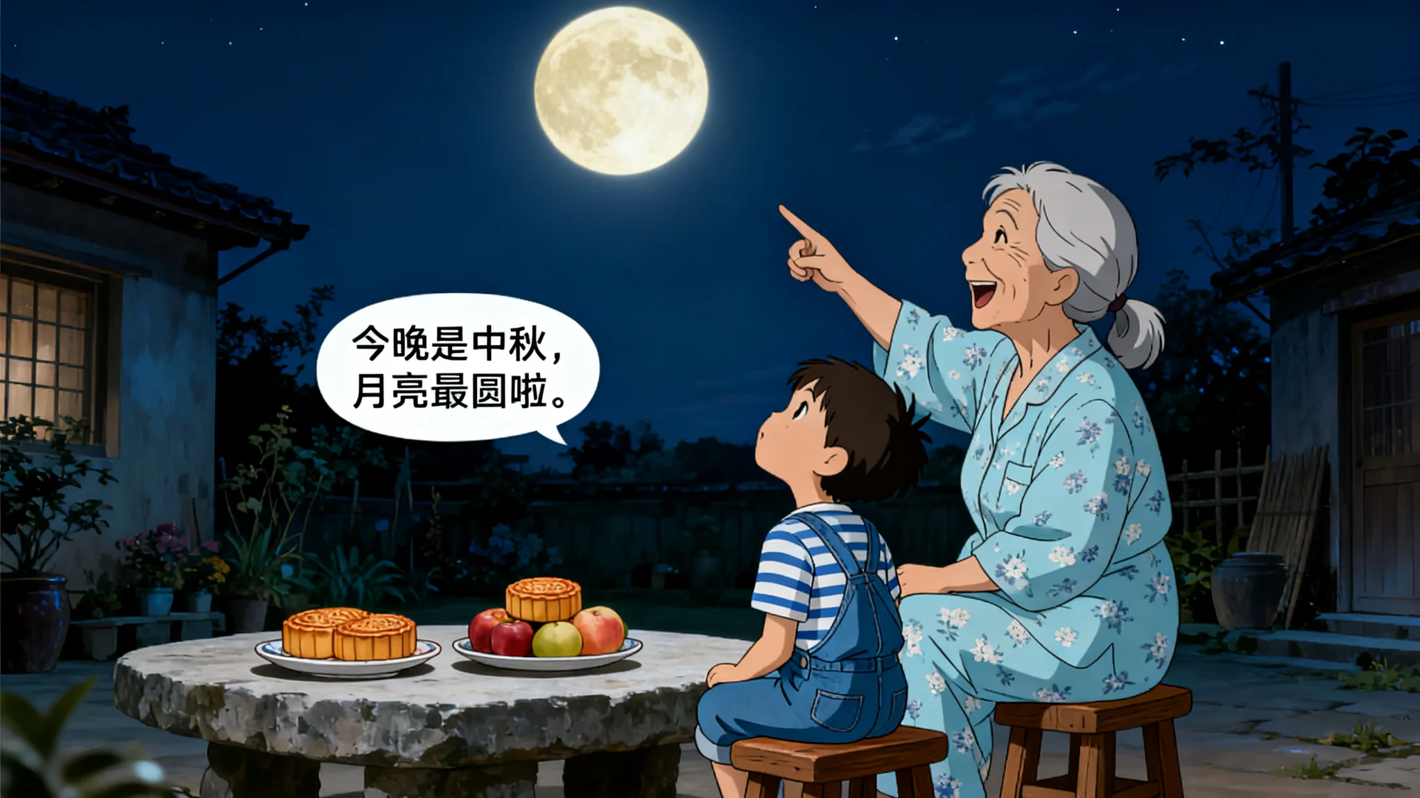 参考图1风格,图2形象,图3形象生成:夜幕下的小院,石桌上摆着月饼与果盘,白发奶奶穿浅蓝碎花睡衣,5岁孙子穿蓝白条纹短袖配牛仔背带裤,两人并排坐木凳。孙子仰头看天:“奶奶,月亮好圆呀!”奶奶笑着指向月亮:“今晚是中秋,月亮最圆啦。”,画面比例为3:4。