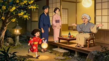 镜头环绕赏月台,展现奶奶给女孩讲述月亮传说,女孩举着兔子灯笼认真倾听