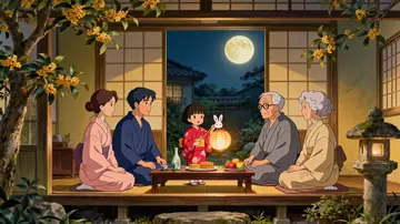 镜头拉远至夜空,满月下的房屋庭院灯火温暖,飘落的桂花花瓣在空中飞舞