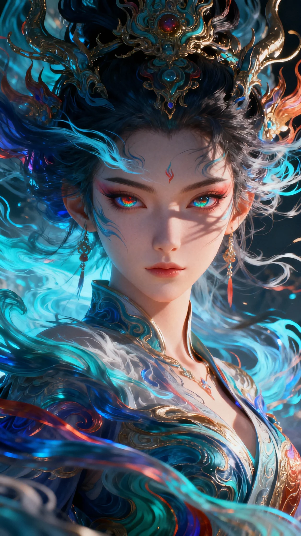 风神女大帝,意向,虚拟,震撼,流动,高清,32K,动漫形象,眼睛有影子,眼里有风彩,神秘抽象美,壮观,拟人化 动漫形象,山海经形象,震撼,帅酷 oc渲染 加一些色彩对比 超高清分辨率超现实主义,3D32K 光线渲染 壁纸