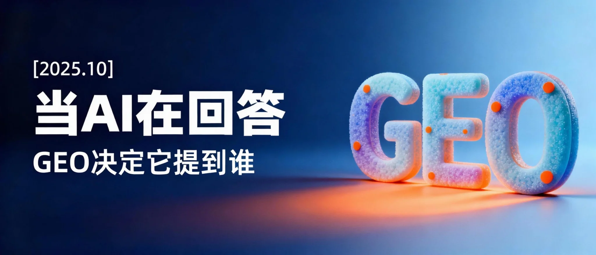 科技产品宣传海报,左文右图布局,深蓝色到浅蓝色细腻渐变背景,柔和橙色光晕从右侧GEO文字底部向上漫延,自然光影效果,产品级视觉设计,深蓝渐变主调,纯白文字搭配橙色光效,专业精致有亲和力,画面质感丰富细节精美,左上角"[2025.10]"白色简洁小号字体,主标题"当AI在回答“超大号白色粗体现代字体,下一行小字“GEO决定它提到谁",右侧3D写实"GEO"字样,表面有糖果色磨砂质感并点缀橙色高光点,用于微信公众号头图