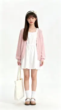 完整呈现人物造型细节。通过自然优雅的动态展现服装:先顺时针缓慢转身,清晰露出服装背部设计,随后再继续顺指针转到正面,整套动作连贯流畅,全程聚焦并突出穿搭的细节亮点。采用固定镜头拍摄,镜头保持静止状态,以全身构图呈现,确保整体造型与动态过程中的细节都清晰可见。风格定位为时尚穿搭展示短片。人物动作需自然舒展、尽显优雅,光线采用均匀柔和的打光方式,着重凸显服装材质质感,整体营造出清新雅致的氛围。比例9:16