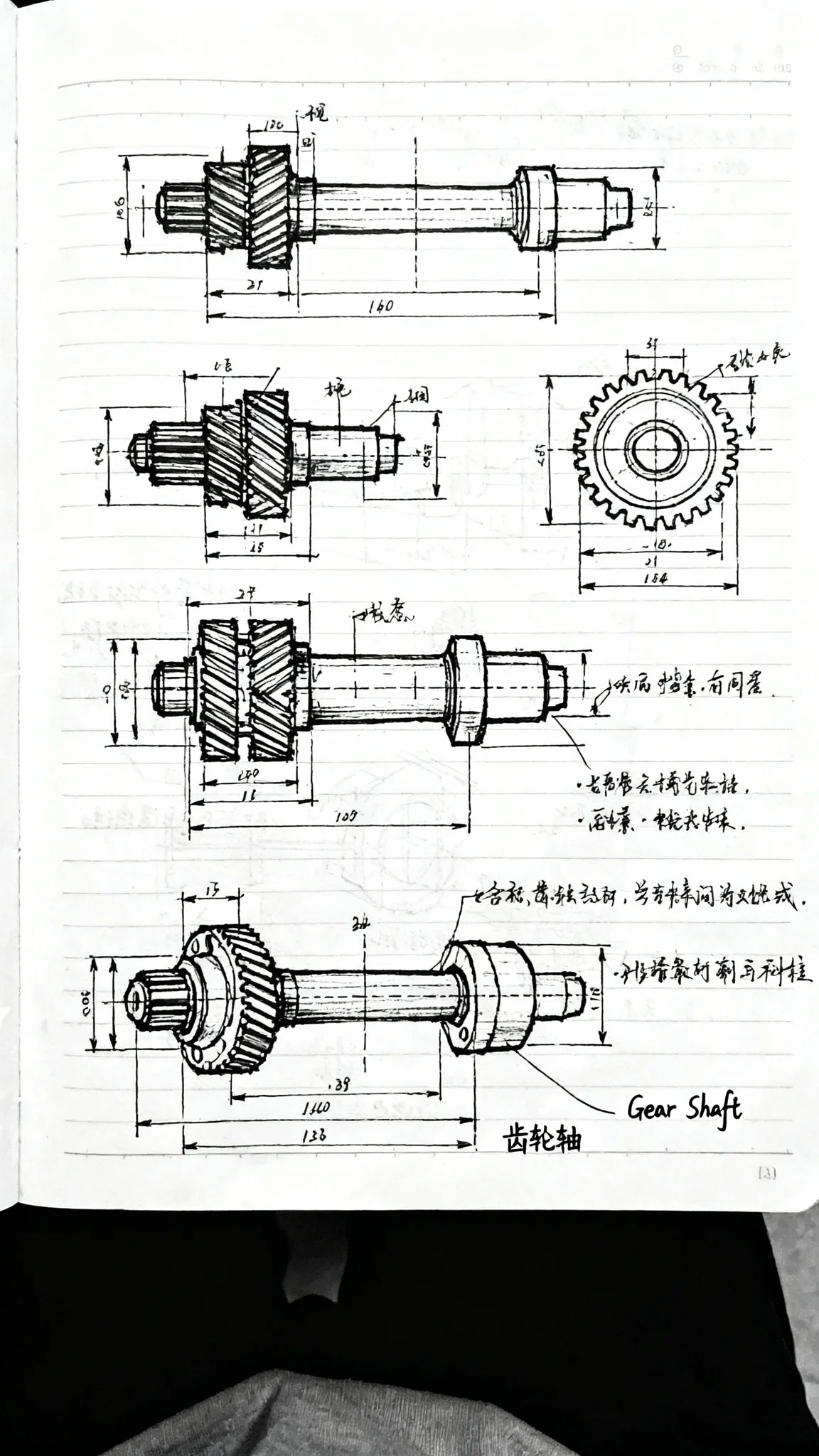 黑线速写,机械设计学笔记,笔记式排版密密麻麻,配有三视图、尺寸标注、名称注释和中英文标签说明。