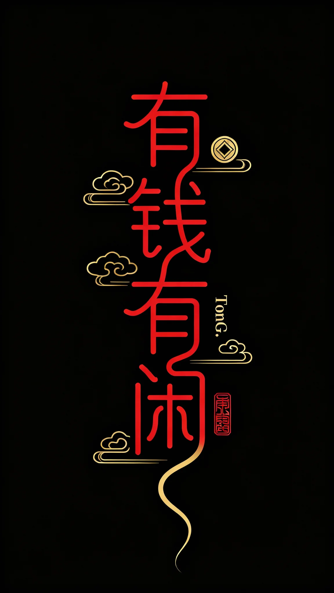 矢量风格的大写意字体竖体连笔图形标志,线条优美,抽象,内刚外柔,完美融合,通过平面几何图形变形组合设计,营造出中式传统文化古韵氛围的字体logo,采用极简线条流畅连笔化设计,呈现古朴典雅的篆刻艺术风格,在扁平化的极简纯色黑色背景上,遵循美学三大构成原理。画面干净无平面几何图形。新中式创意书法字体、传统书法笔势、现代艺术造型、传统文化艺术“有钱有闲”主体为红金色线条构成的篆文,线条弯曲流畅连体,呈现古朴典雅的篆刻艺术风格,英文小字写:~“TonG.”简洁精致,注重线条细节,如流水般的丝滑之美,采用融合传统书法笔势与现代艺术创意的新中式字体呈现,字体笔画既延续书法线条的灵动韵律,又通过夸张变形、装饰化处理打造出富有张力的艺术感,搭配一枚中式传统红色印章,整体设计深度蕴含中式传统文化艺术底蕴,同时以精致且极具创意的笔画细节,曲线变形艺术字体,融入笔画的自然弯曲、舒展延伸或轻微缠绕,展现出绝美的现代书法艺术表现力。竖排形式呈现,大气,错落有致,动画艺术,将云纹和铜钱纹融入笔画内部。