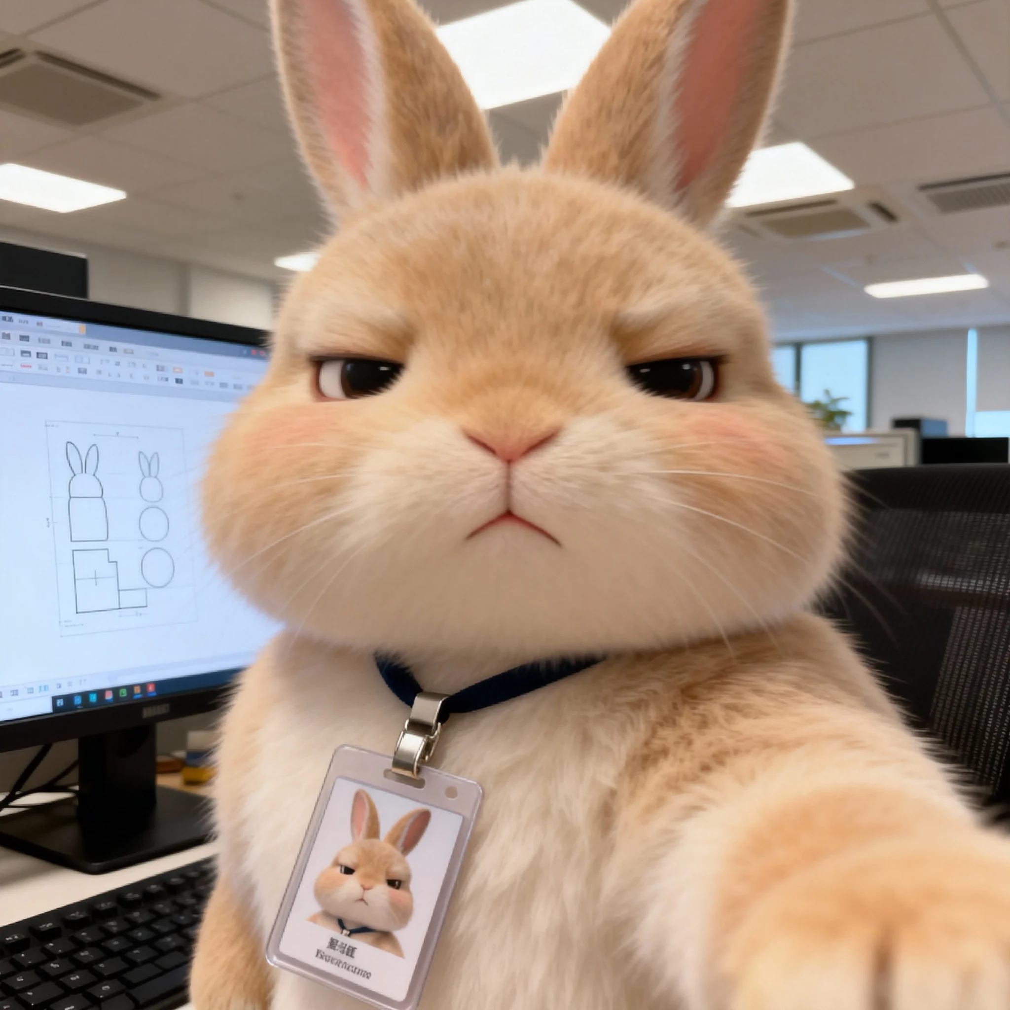 一只拟人化的小兔,以日常快照的视觉风格展现,照片中没有明确的主体或构图感,还带有轻微的运动模糊。主角占据画面中心位置,是自拍的大头照,脸上带着厌世的神情,它脖子上挂着一个带有自己大头照的工牌。背景是办公场景,旁边的电脑屏幕上是平面设计的页面,营造出一种平凡又独特的氛围。