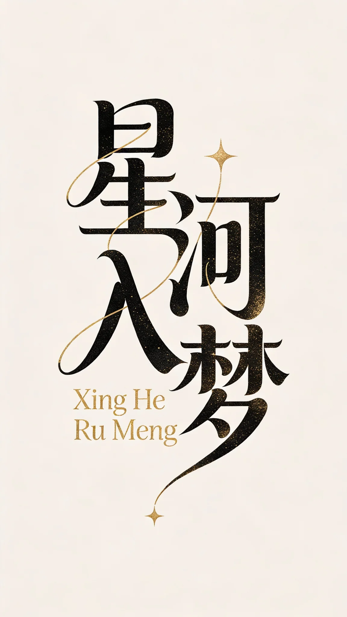 花体艺术字设计,致敬小林章精致风格,高级配色(墨黑+鎏金),磨砂金属肌理,美好四字“星河入梦”,小字“Xing He Ru Meng”,流畅连笔+横细竖粗,字间笔画缠绕连接,撇捺延长带星光装饰,鎏金烫印质感,纯色背景,高级感拉满