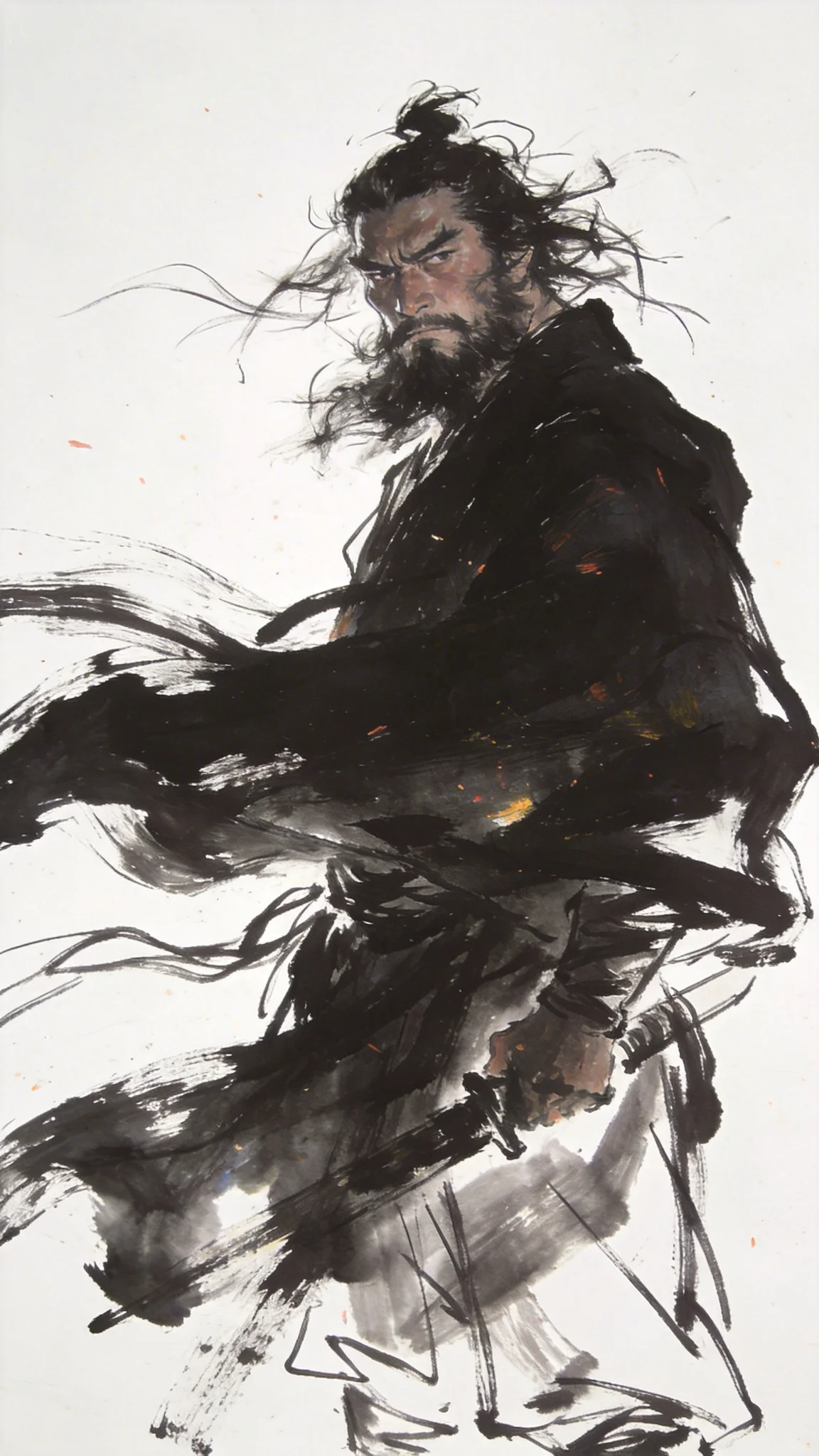 灵魂画手,手绘线稿,涂鸦风格,简约,大写意笔触,夸张奔放的潦草随意线条,比例失调的人物与景观重构,油画风格,油画厚涂,视觉冲击,刮刀,动态模糊,迷幻,光影美学,朦胧美学,多重曝光,暗调与高曝,拖影,手稿,大师杰作,白色背景,大风,粗犷不羁硬汉,坚毅,不修边幅,头发凌乱,胡子拉碴,东方