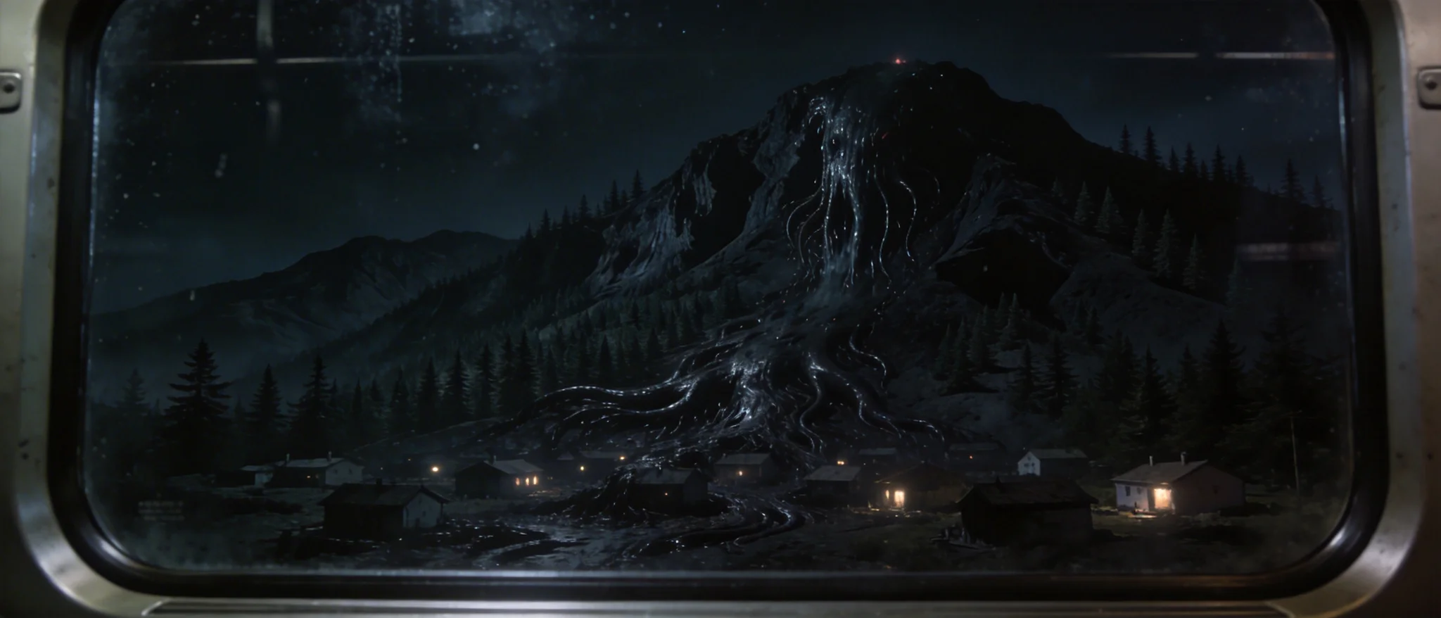 夜晚,火车车窗外的远景。远处黑色山脉绵延,山脚有零星低矮住宅,“所有住宅的灯光刚刚同时熄灭”。黑山表面剧烈震动,粘稠的黑色液体如活物般从山顶流淌而下,向山脚的住宅蔓延,吞噬房屋。山体轮廓开始扭曲变形,夜空漆黑无星。画面通过车窗玻璃呈现,玻璃上有细微反光和污渍。黑山表面是密密麻麻的松树。整体氛围压抑、神秘,洛夫克拉夫特式克苏鲁恐怖风格,超现实,黑暗,电影感构图。