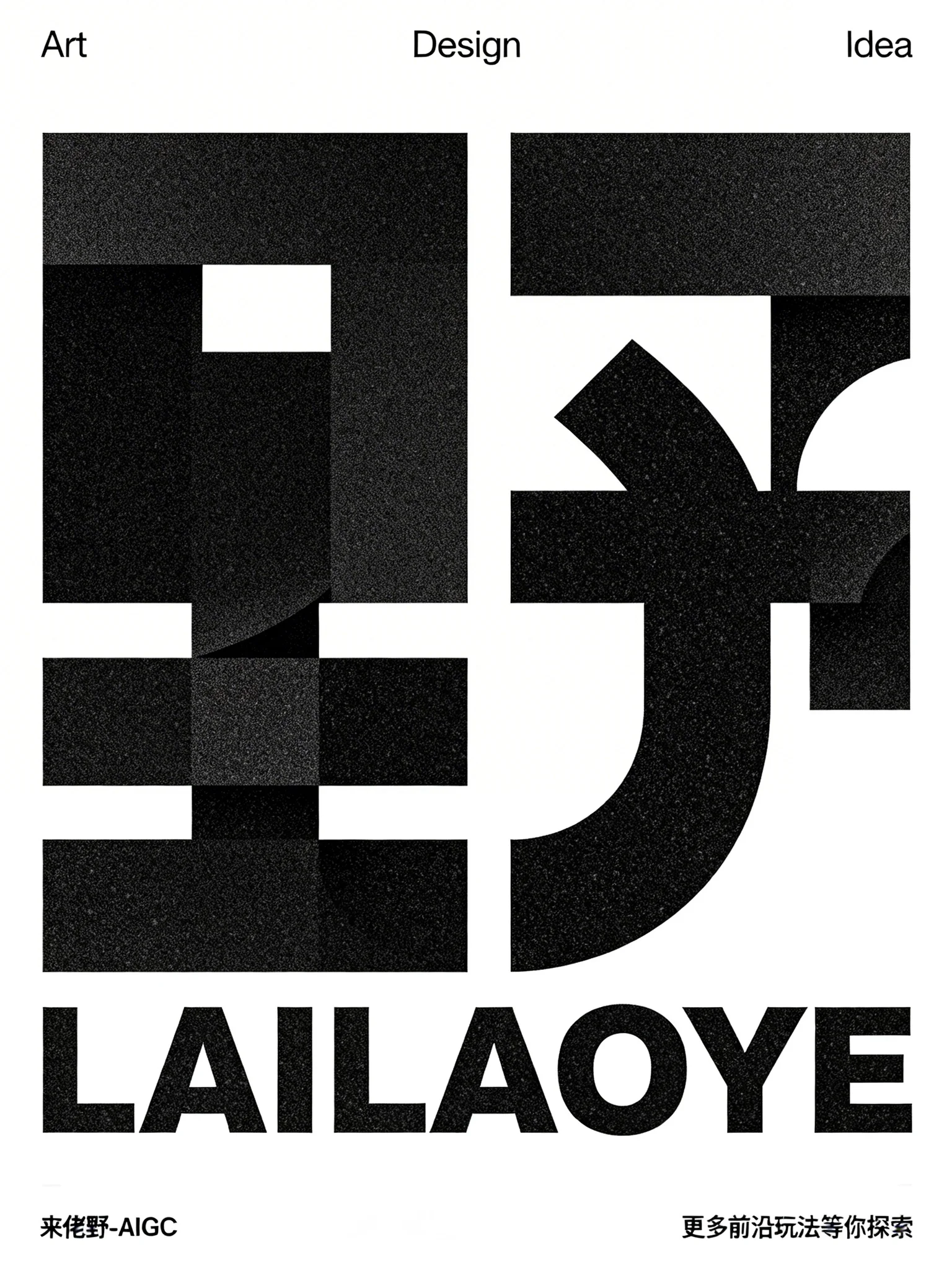 用“来佬野”这个词,创作LOGO。logo下方文字LAILAOYE。视觉风格为复古几何构成风,带有 Mid-Century Modern(中世纪现代)设计的厚重质感。笔触用法采用纯黑块面的几何拼接,以带颗粒感的纯色填充,通过矩形与弧形结合的块面组合塑造字母形态;笔画结构上,打破传统字母的书写逻辑,用直线与曲线块面进行解构重组,直线的硬朗与曲线的柔和形成强烈视觉对比,块面的穿插切割营造出丰富的层次与正负形趣味,整体呈现出复古又极具现代感的平面构成效果,兼具字母识别性与艺术表现力。画面上方有极小极细无衬线字体"Art"、"Design "、"Idea",极小左下角标注 “来佬野-AIGC” 右下角标注 “更多前沿玩法等你探索”。