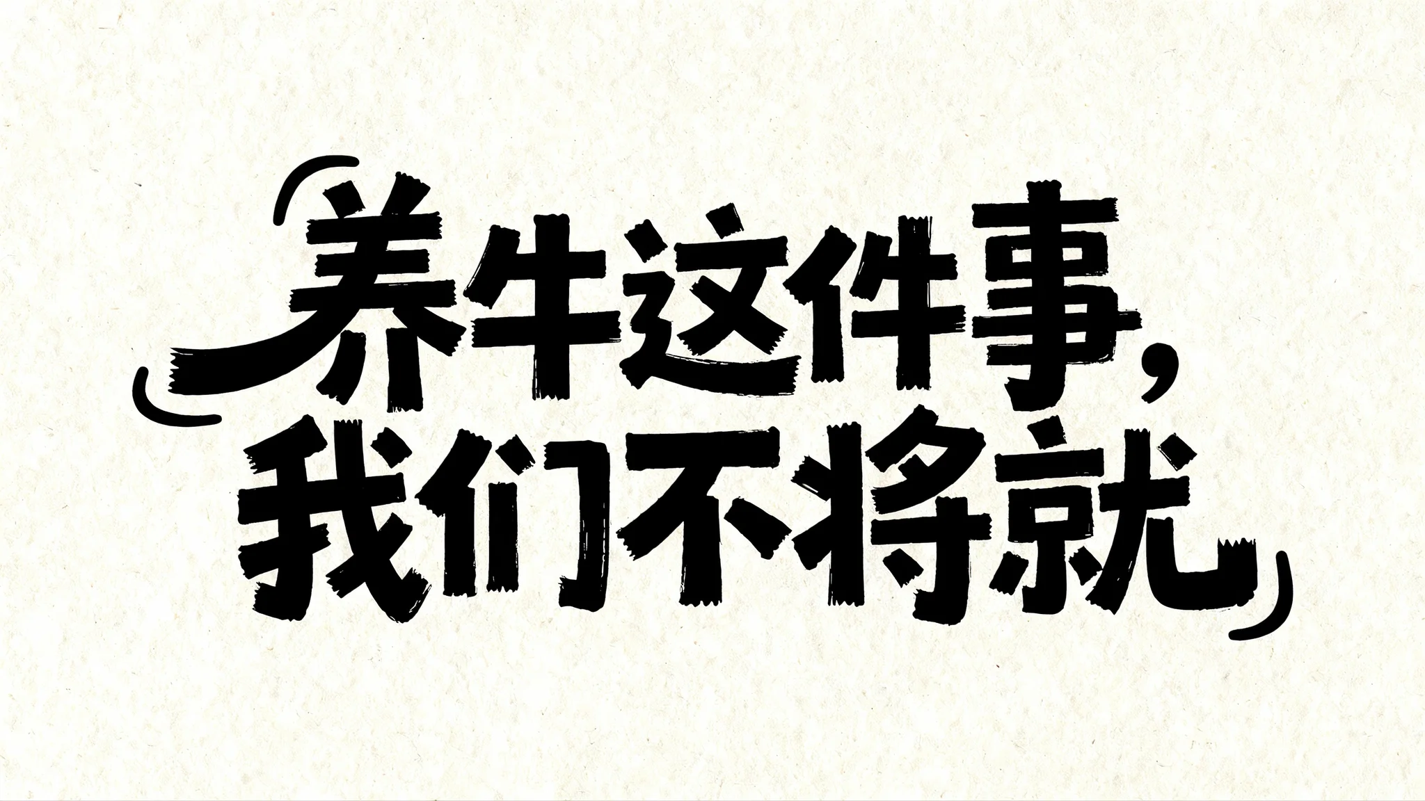 手写字体海报设计,大留白,文字“养牛这件事,我们不将就”横排,手写艺术字体,一行文字,文字大小对比非常强烈,模拟三岁小孩手法,文字大小错落排布,文字东倒西歪,紧凑排版,笔画不流畅感明显,笔画夸张变形,极具张力,有粗有细,俏皮,不规则边缘,拼凑感,懒惰感,笨拙,粗笔触,字形灵动有张力,笔画长短对比强烈,部分笔画长的夸张,伸出画面外,弯曲,仿生,具现代艺术设计感,艺术作品,儿童艺术风格,视觉冲击强。黑色文字,米白色背景,细腻的磨砂质感背影,整体中式艺术海报排版。
