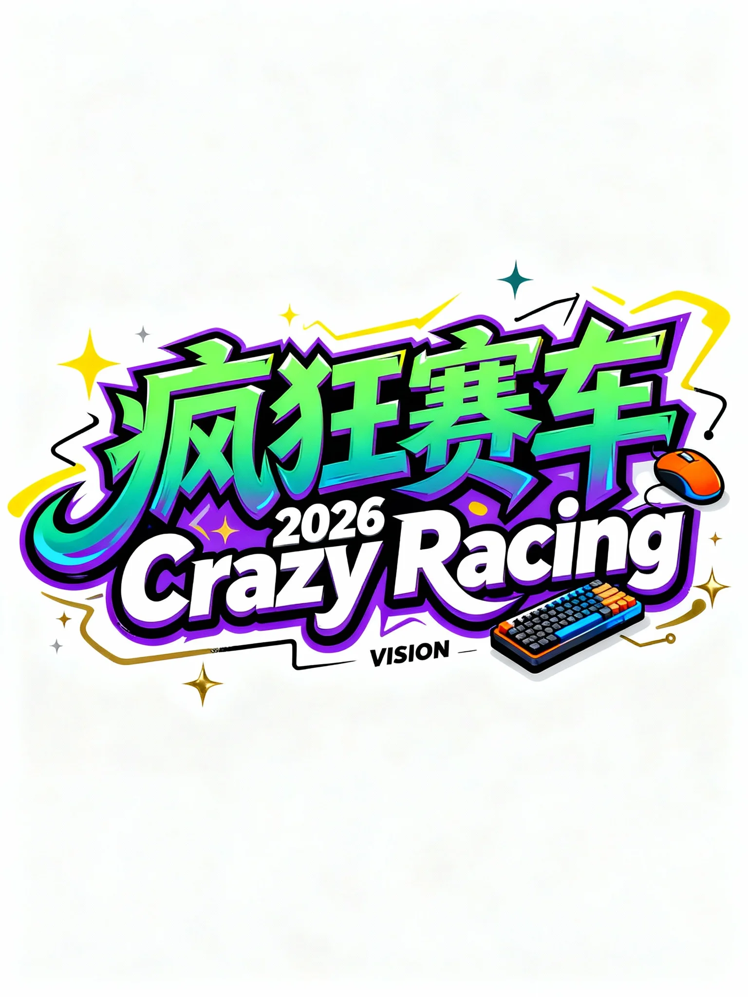 白底,干净的背景,创意立体字体设计“疯狂赛车”,搭配英文“2026 Crazy Racing”进行排版,颜色以绿紫渐变色为主色,搭配黄、白、橙、蓝、金色做点缀,色彩鲜艳,过渡自然。融入鼠标、键盘、电竟相关元素设计,笔画粗旷,夸张的弧度,强烈的街头涂鸦风格,字体造型充满动感且棱角分明,融合尖锐边缘与流畅曲线,营造出大胆、视觉冲击力强的装饰性字体效果,部分笔画进行连接和共用笔画,加入线条和星星点缀色,笔画转角圆角处理,笔画延伸,居于画面中心,简约而强大。小英文VISION。