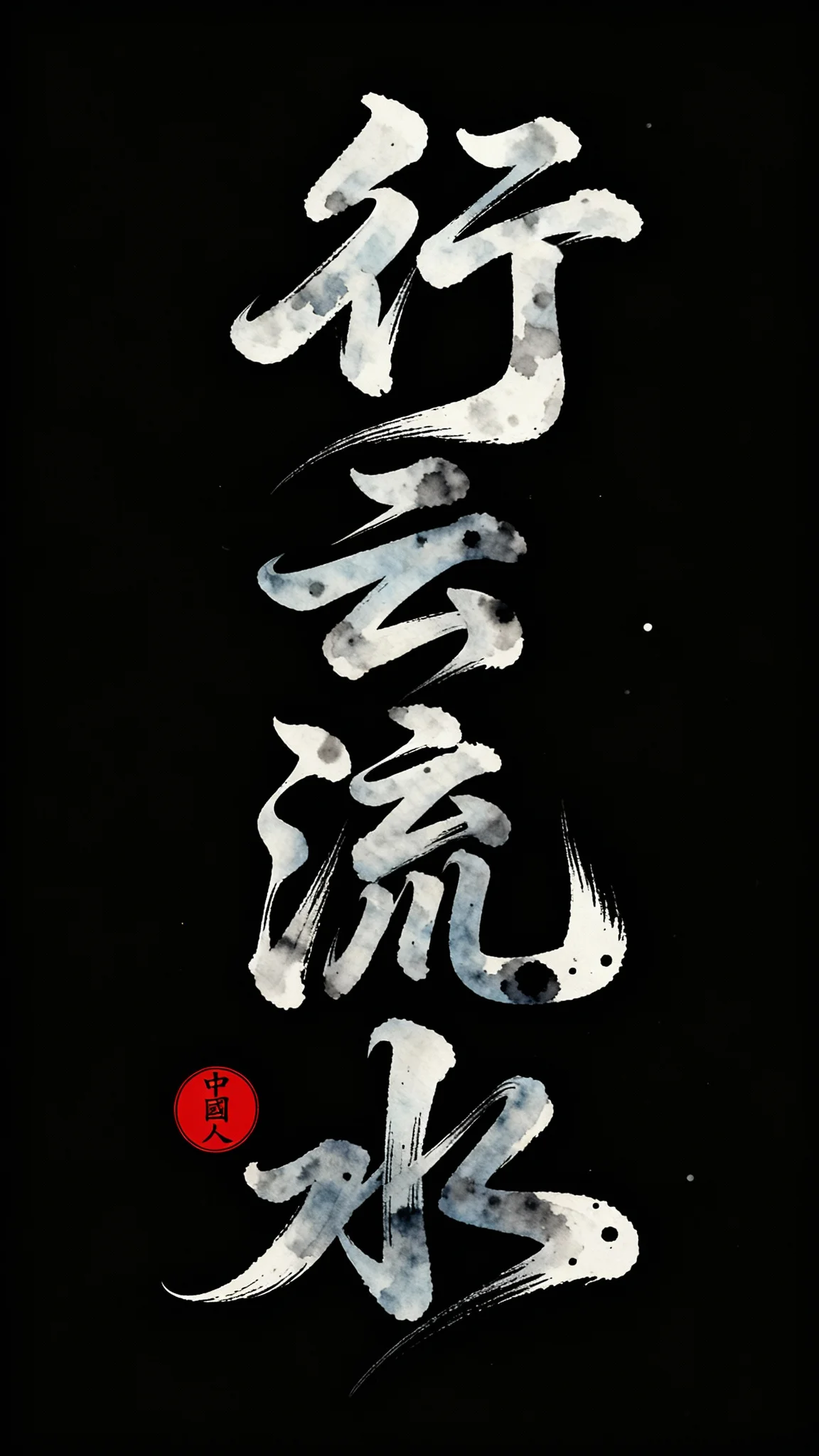 狂草书法风格,"行云流水" 四个大字采用竖向排版,笔画如云朵般飘逸如流水般顺畅,字体结构舒展自然,笔画连绵不断一气呵成,适当运用淡墨和飞白效果增强空灵感,墨色清淡雅致间有浓墨点缀,笔法上采用流畅的侧锋行笔和轻柔的提笔,节奏舒缓自然,字间距离疏密有致,纯黑色背景突出白色字体,在字体的左下角点缀红色圆形印章 "中國人",整体呈现出行云流水般的自然美感和艺术境界,文人级书法作品,4K 高清画质,文人书法品质,细节精致,具有强烈的美感和艺术感染力。