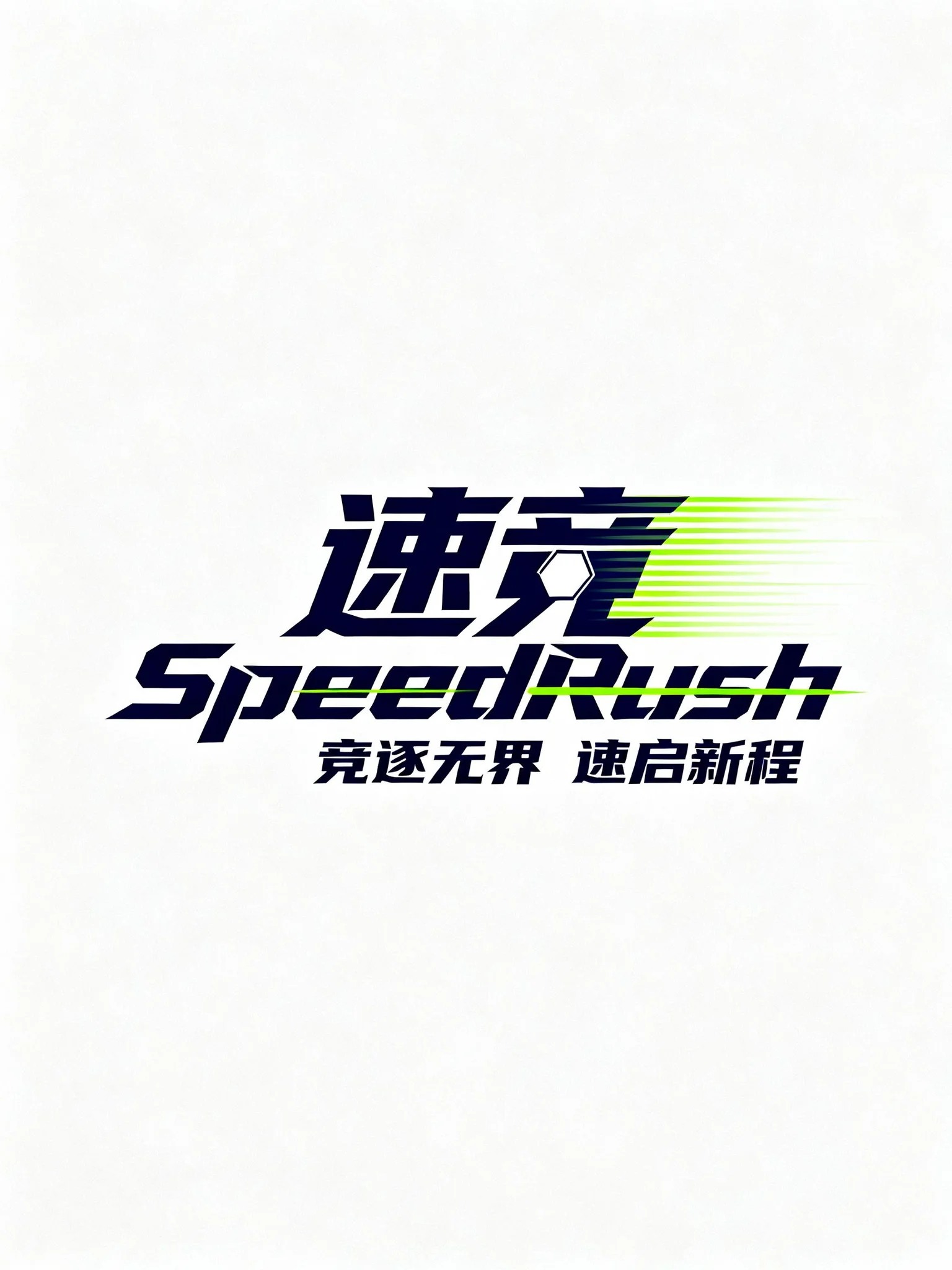 大师级艺术创意字体设计 纯色背景 纯字体设计 无其他元素 中文字体"速竞" 英文字体"SpeedRush" 中英文之间空格 品牌slogan"竞逐无界 速启新程" 字体设计风格为科技运动风 品牌颜色采用深空蓝为主色 荧光绿为辅助色 中文字体设计思路:对"速"字笔画进行斜向重构,右侧走之底用流畅的渐变色线条替代,模拟气流运动轨迹,"竞"字中间的"口"设计为六边形,增强科技感,笔画边缘做锐化处理,增添锋利感 英文字体做装饰设计:"Speed"字母采用几何切割笔画,边角锐利,"Rush"字母间用荧光绿线条连接,呈现速度递进感 整体字体结构全新设计,注重笔画细节的光影处理,符合运动服饰行业科技、动感的品牌设计思维