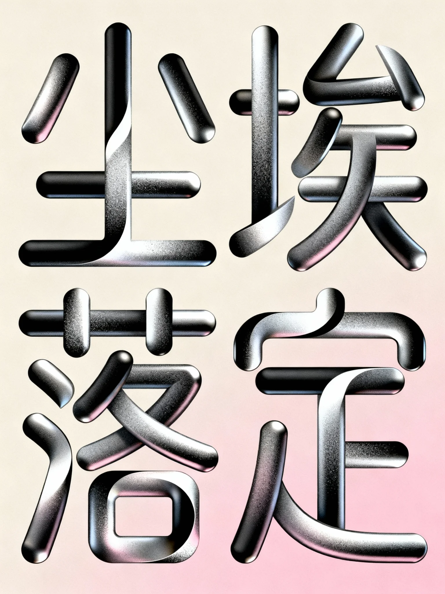 对 “尘埃落定” 两个汉字进行艺术化解构与重构,以立体渐变的线条形态呈现,笔画相互缠绕、穿插,形成具有空间感的字体造型。简洁的纯色背景,无多余元素,突出字体主体。现代字体设计风格,融合立体主义艺术手法与平面构成形式美感,属于创意汉字艺术设计。字体以黑、白、灰三色渐变为主,呈现金属质感的深浅过渡;背景为浅米色到淡粉色的柔和渐变,整体色调简洁且富有层次。采用平视正视角,“中”“国” 二字左右对称分布,占据画面主要空间,布局平衡规整。字体边缘光滑,渐变过渡自然,带有轻微颗粒纹理质感;线条的弯曲弧度和穿插结构精准,营造出强烈的三维立体视觉效果。
