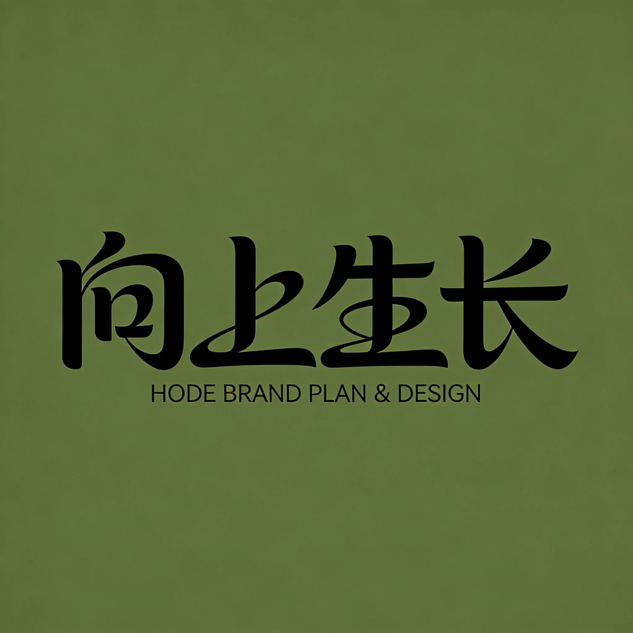 创意字体设计LOGO,中文“向上生长” ,线条流畅、舒展且具有艺术感,将字体进行抽象变形,似是而非,相邻两个字上一字的末笔是下一字的首笔,相邻字的笔划可以共享借代。使几个文字成为一个紧凑的整体,字与字之间有相互联系的笔划。高级感,扁平化,墨绿色高端大气背景,小英文“HODE BRAND PLAN & DESIGN”。