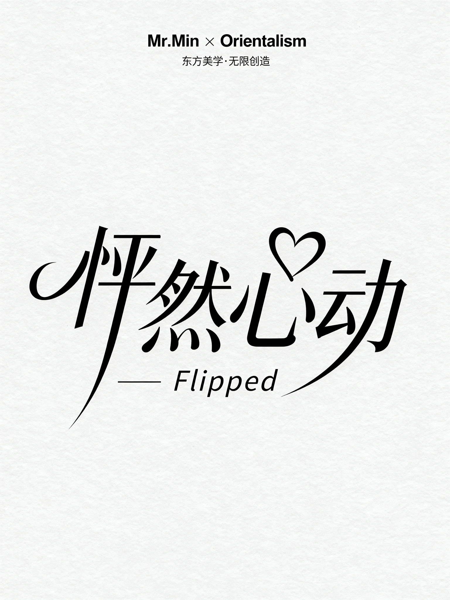 浅灰色背景,主体为现代艺术手写创意字体 “怦然心动”;字体笔画融合柔美曲线与锐利直线,曲线飘逸延伸(如 “怦” 的竖弯、“心” 的弧形笔画),直线挺拔利落;字形呈横向舒展且略带动态倾斜的布局,字间笔画相互呼应、富有视觉流动感;笔画粗细对比细腻(主笔稳重、辅笔纤细轻盈),线条边缘光滑自然;下方搭配纤细无衬线字体 “Flipped”;整体营造 浪漫细腻、心动时的轻盈艺术 氛围,突出字体的曲线韵律、动态布局与中英文风格融合的效果。文字细节:上方有 “Mr.Min × Orientalism” 无衬线体的字样,表明这是 “东方美学·无限创造”无衬线体小字居中, 旗下品牌的合作。
