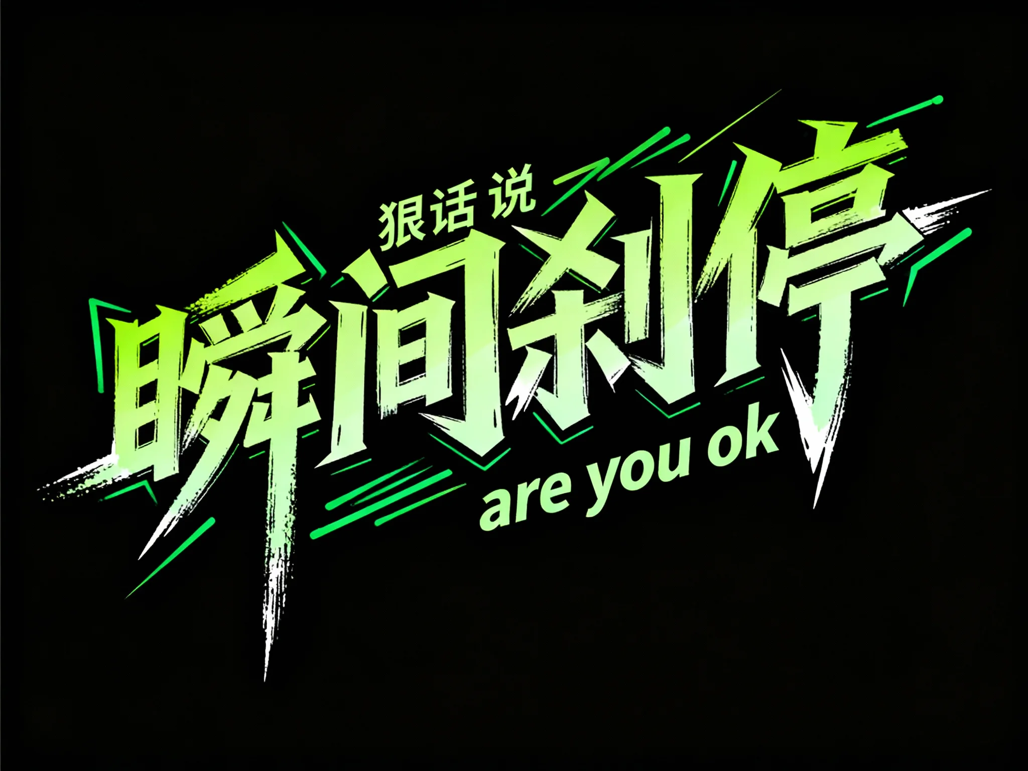 纯黑色背景,主体为手绘涂鸦艺术字体 “瞬间刹停”;字体风格街头叛逆、充满活力,字形态夸张变形(大幅倾斜、峰谷尖锐),笔画粗细对比强烈(主笔粗壮、辅笔纤细),边缘带绿笔 / 马克笔手绘的颗粒感毛边,部分笔画末端有飞白或尖锐切割,色彩为深绿到浅绿的渐变;文字呈斜向动态布局(“狠话说尽” 倾斜字间局部穿插);下方搭配纤细浅绿色无衬线辅助文字(“are you ok ”;整体营造 “街头艺术感 + 热情活力” 的视觉效果,突出字体的手绘毛边、荧光绿渐变与动态倾斜特质。