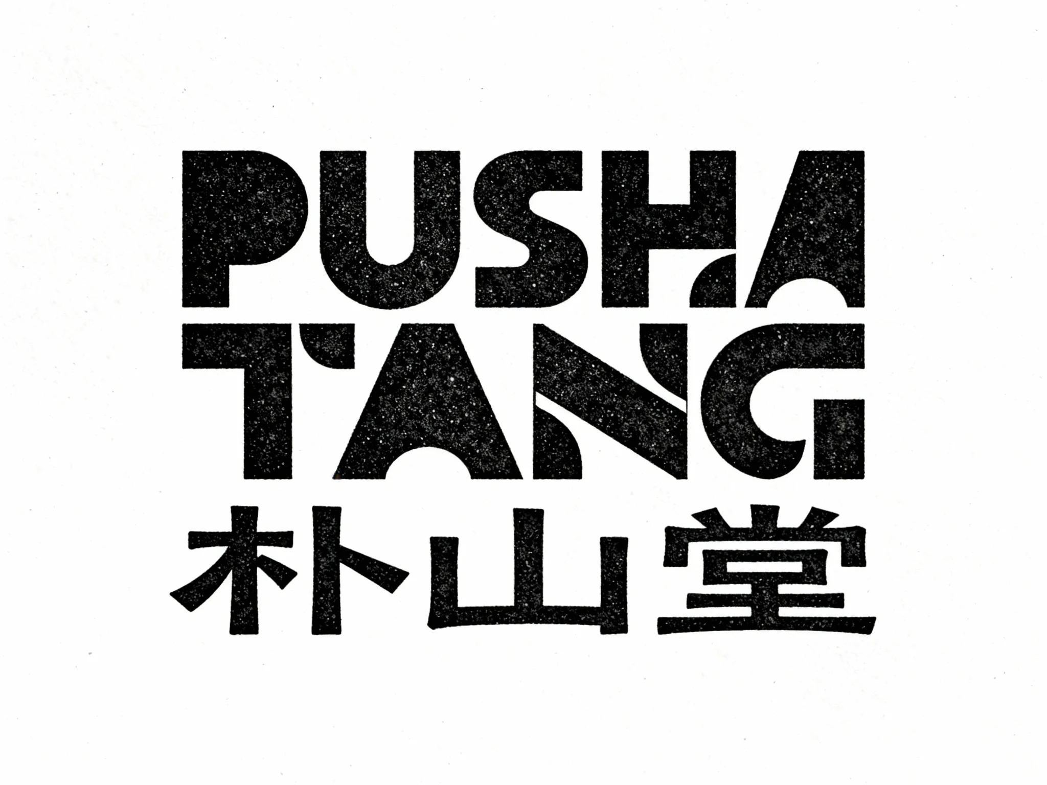 用“朴山堂”,创作字母 LOGO。logo下方有品牌名称PUSHANTANG。视觉风格为复古几何构成风,带有 Mid-Century Modern(中世纪现代)设计的厚重质感。笔触用法采用纯黑块面的几何拼接,以带颗粒感的纯色填充,通过矩形与弧形结合的块面组合塑造字母形态;笔画结构上,打破传统字母的书写逻辑,用直线与曲线块面进行解构重组,直线的硬朗与曲线的柔和形成强烈视觉对比,块面的穿插切割营造出丰富的层次与正负形趣味,整体呈现出复古又极具现代感的平面构成效果,兼具字母识别性与艺术表现力。