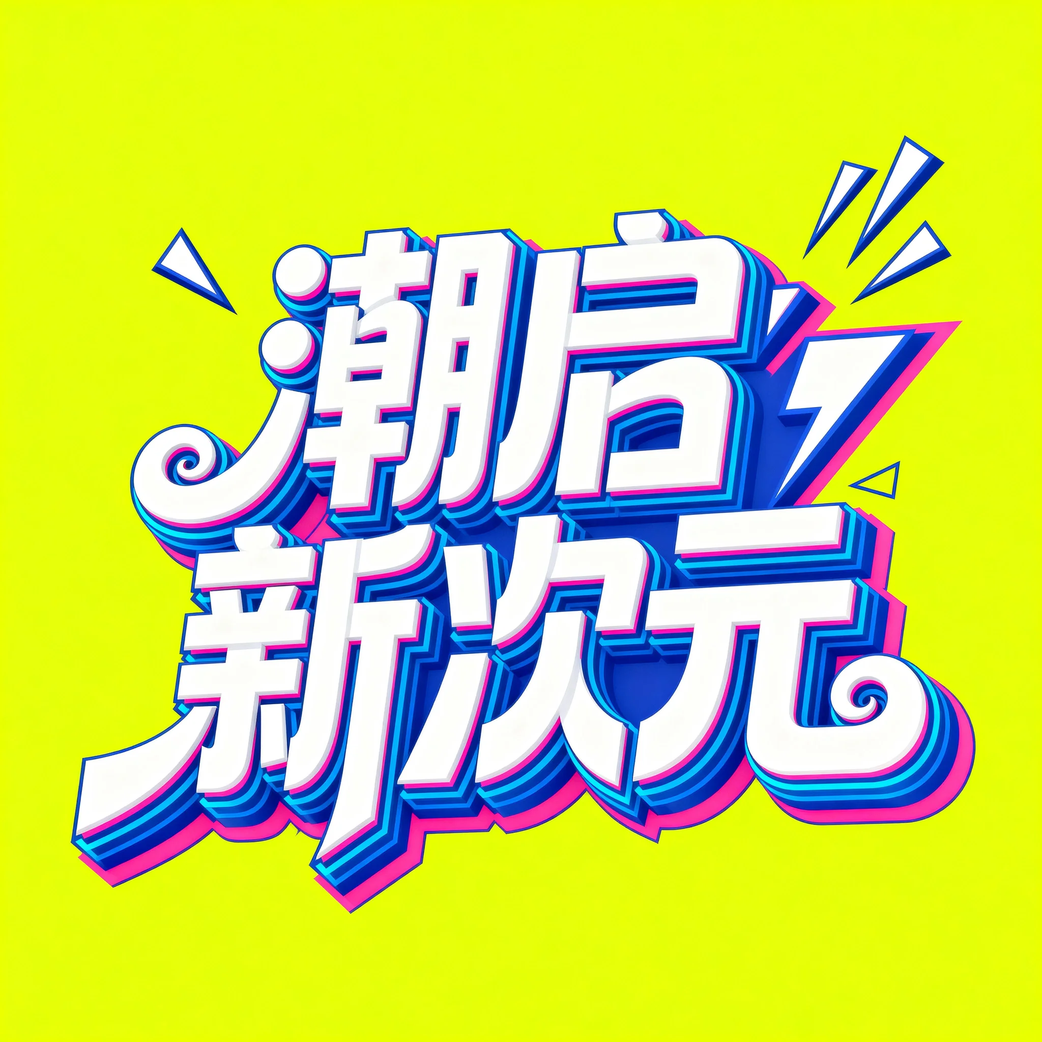 潮流创意风格字体设计,文字内容为"潮启新次元",采用立体3D效果的卡通字体风格。字体结构错落有致,笔画粗细对比强烈,主笔厚重饱满,副笔轻盈灵动。整体字形打破常规框架,部分笔画带有夸张的几何延伸,如三角形、漩涡曲线等装饰元素。字体颜色以白色为主,搭配蓝色和粉色的立体描边效果,营造出丰富的层次感。背景采用鲜亮的明黄色纯色,简洁干净无多余装饰。字体整体呈现出前卫个性、充满能量与突破感的视觉效果,完美适配潮玩与电竞等年轻文化场景,精准体现"Start the trend"的先锋创意理念。